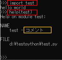 以下のようにimport(ファイル名はtest.py)した後にhelpコマンドを入力するとdocstringが表示されます。