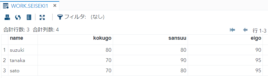 proc sort data = WORK.seiseki1 OUT=WORK.seiseki1srt;