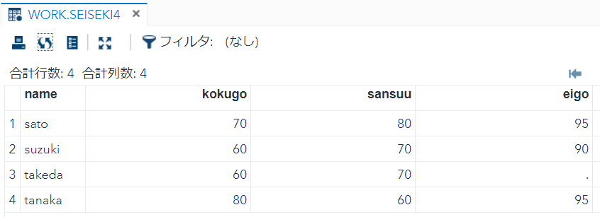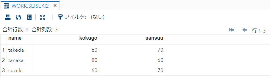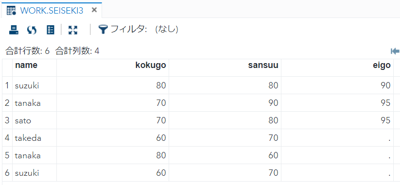 proc sort data = WORK.seiseki2 OUT=WORK.seiseki2srt;