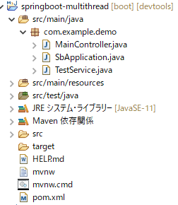 画面にアクセスするとMainController.javaからマルチスレッドでTestServiceのメソッドを実行します。