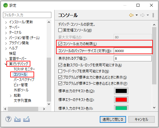「コンソール出力の制限」のチェックを外します。または、「コンソールのバッファー・サイズ(文字)」を1,000,000に設定します。(ダイアログ中段の訳です)