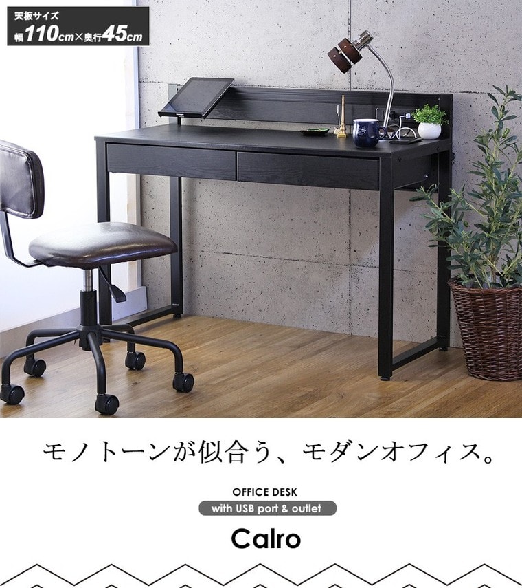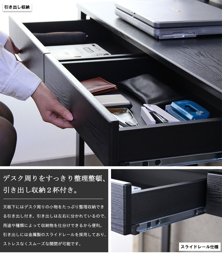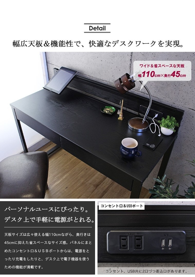 1.引き出し付きパソコンデスク 【二口コンセント・USBポート付き】 ブラック