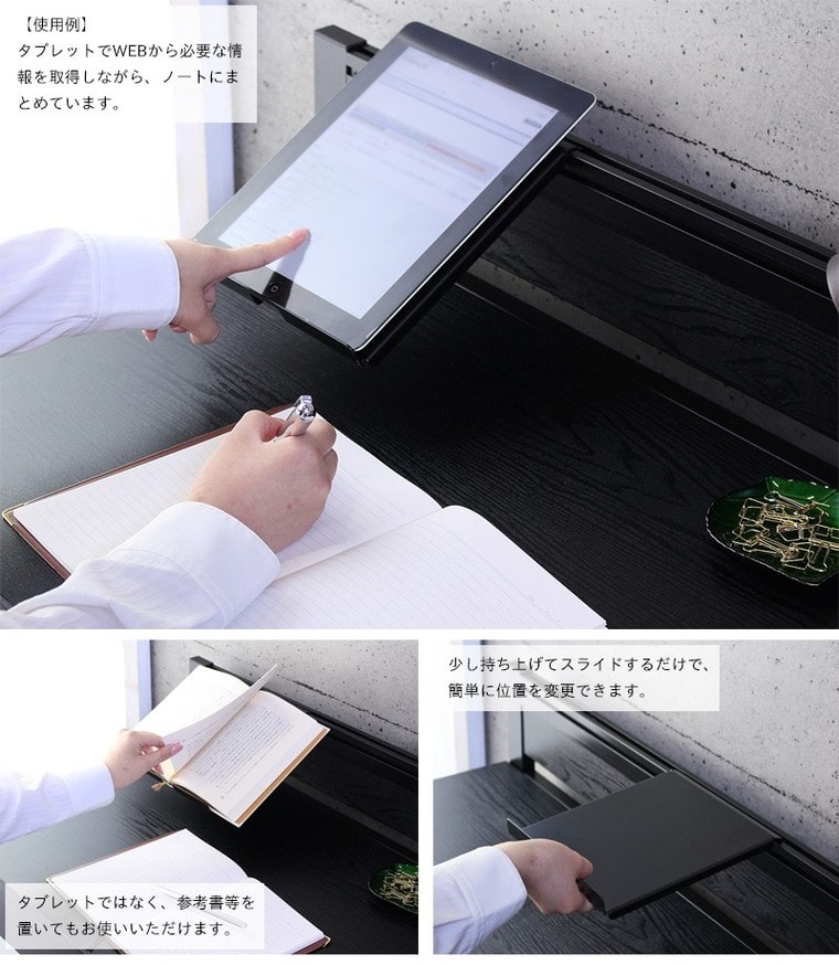 スライドスレーには、タブレットや資料をのせることができます。スライドスレーの位置を変更することもできます。