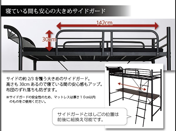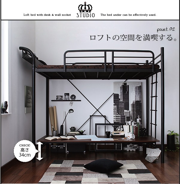 - 2.3段可動デスク付き&コンセント宮付きロフトベッド【Studio】ステューディオ