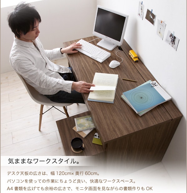 ラックは左右どちらのレイアウトでも可能です。デスクには引き出しもあります。