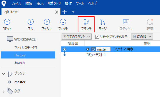 3.作成完了時の画面です。testbranchの前の丸(○)はカレントブランチ(現在のブランチ)を示しています。