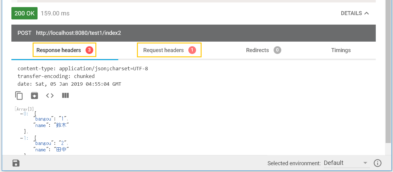 9.実行した結果のレスポンスステータスが表示されます。200は成功です。