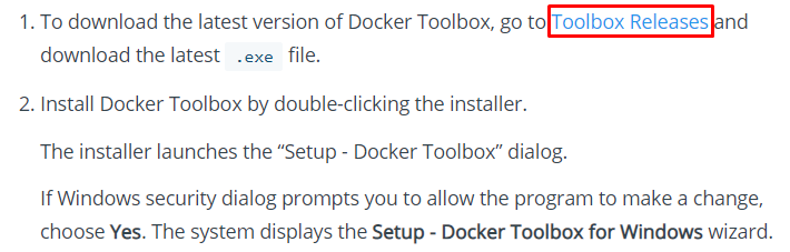- 公式サイトには、Docker Toolboxのインストールは、新しいDocker Desktop for Windows(Mac)アプリケーションの要件を満たしていない古いWindows(Mac)システム環境向けのインストーラと記述されています。