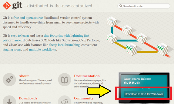 git公式サイトのURLにアクセスして画面右下の「Download x.xx.x for Windows」をクリックするとインストールするファイルのダウンロードが始まります。Git-2.22.0-64-bit.exeを取得しました。
