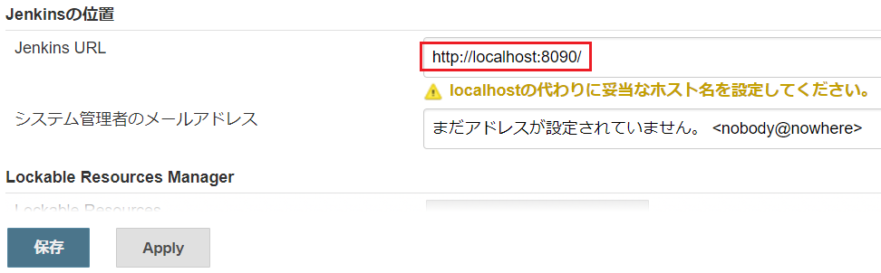 2.「Jenkinsの位置」にあるURLのポート番号を修正して保存ボタンを押します。