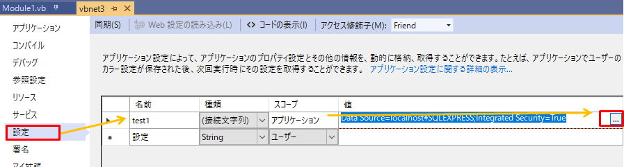 2.「設定」をクリックします。名前は任意の値を入力します。種類は「(接続文字列)」を選択します。スコープは「値」の入力欄をクリックすると、アプリケーションが自動で選択されます。