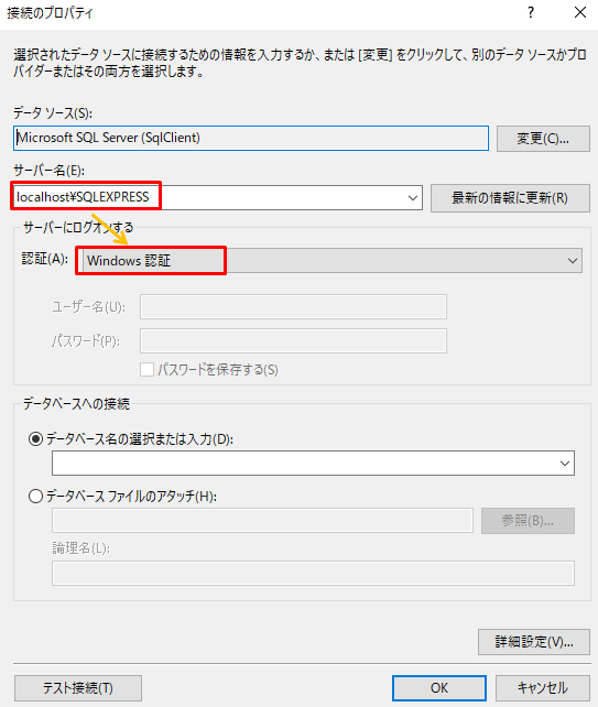 3.サーバー名に、コンピュータ名\インスタンス名を入力し、任意の認証を選択します。