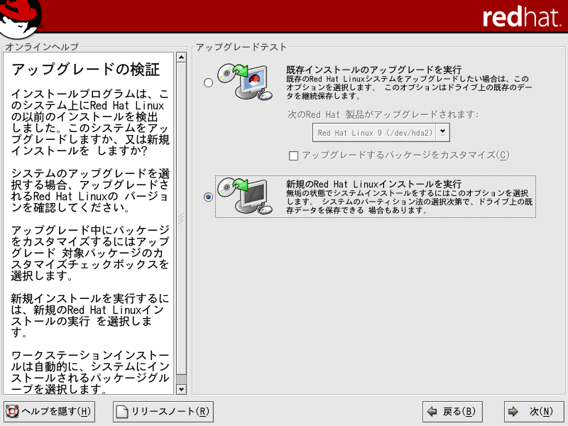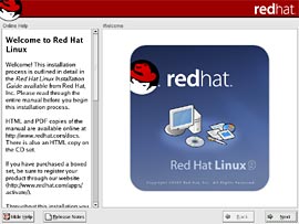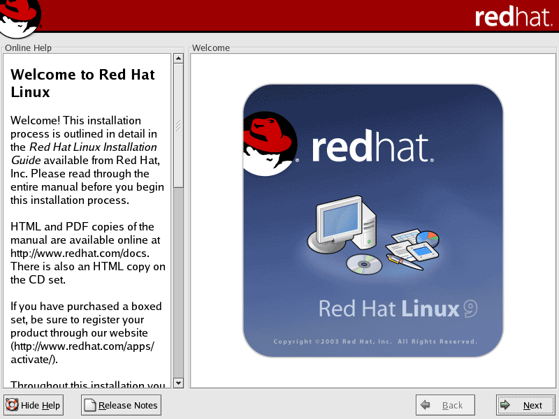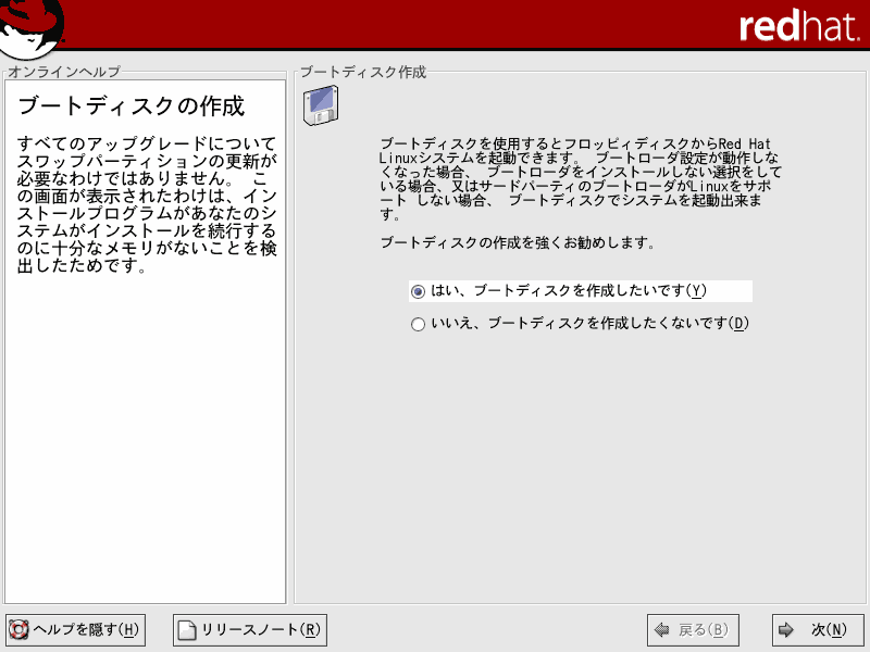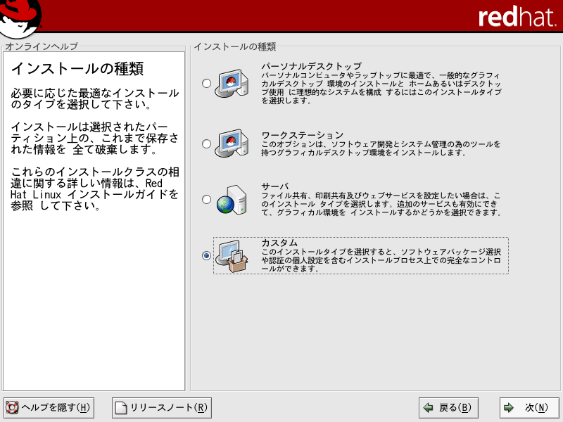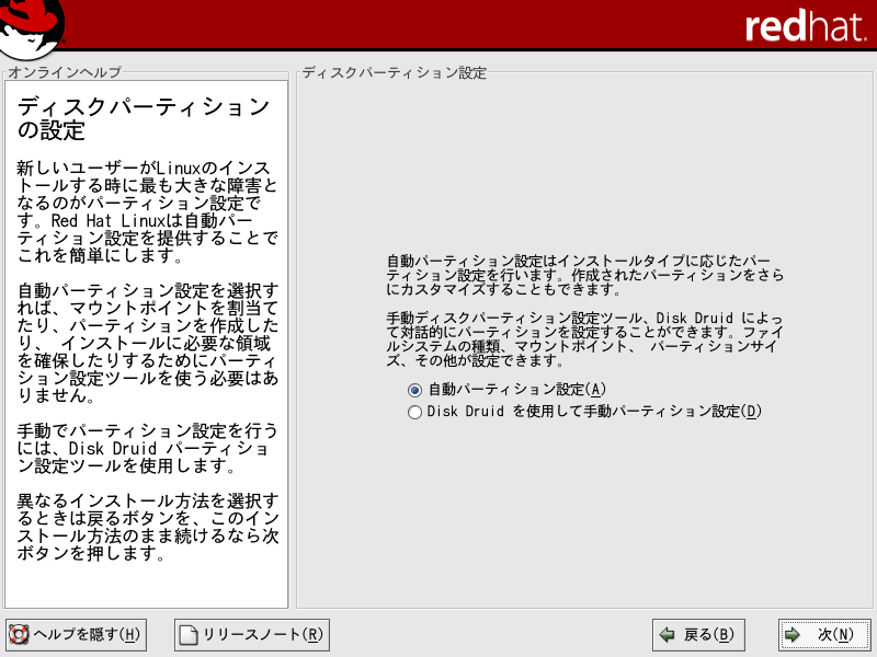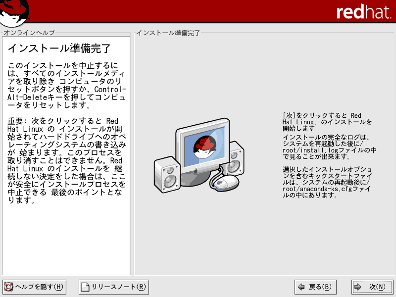ここでは、Red Hat Linux9のインストールについて解説していきます。当ページでは、LINUX初心者を対象とした説明を行っていきます。はじめは何がなんだかわけがわからないかもしれませんが、それでも構わないと思います。特にディスクパーティションの設定は、初めての方にとっては非常にわかりづらいものです。各パーティションにどのくらいの容量をさけばいいのかは、用途や規模(企業用なのか、個人用なのか)、ディストリビューション、あるいはHDDの容量(デュアルブートをしたり等)によっても変わってくるため、頭を悩ますところです。Linux