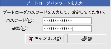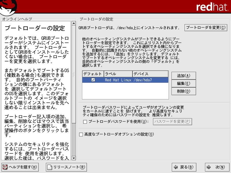 ■13.ブートローダの設定を行います。ブートローダには、LILOとGRUBがあり、「ブートローダを変更」で変更することができます。デフォルトはGRUBです。LILOは将来的には、ブートローダとして外れる予定なので特別な理由がない限りはGRUBを選択するようにしてください。また、Windowsとのデュアルブート構成の場合は、Red