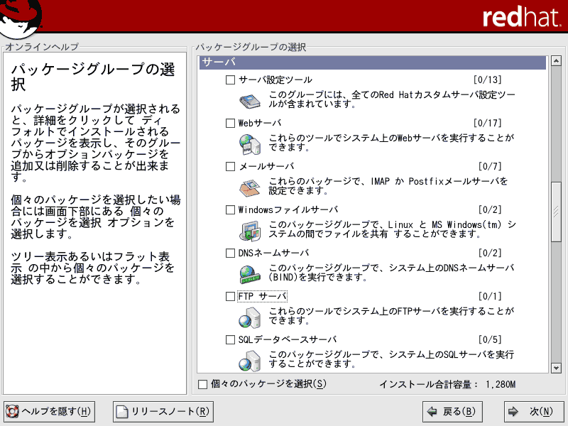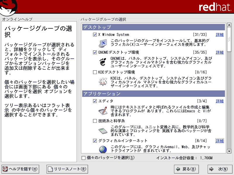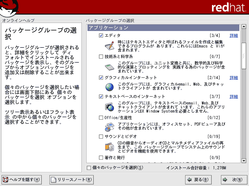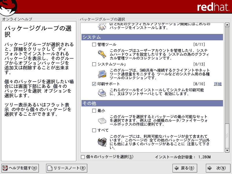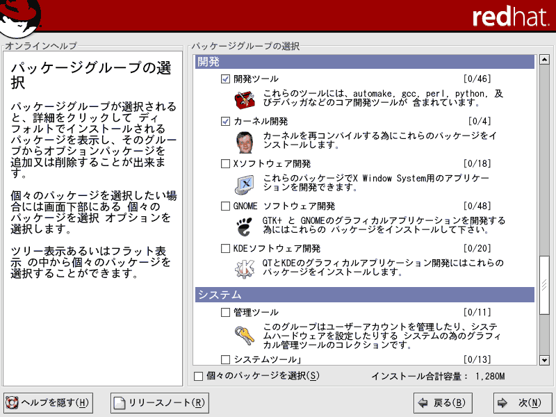 ■26.システム欄の「管理ツール」では、Red Hat 社によって用意されたGUI の設定ツール群が含まれています。「システムツール」は、「詳細」をクリックして好みに応じて必要なものだけチェックを入れてください。結構、役にたつネットワークツールが含まれています。Linux