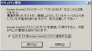 ホストに初めて接続するときには以下のような警告が現れます。ここでは、「172.16.50.3」というホストのエントリが存在しないために警告が出ます。known_hostsリストにホストを追加すると次回以降は警告が表示されなくまりますので、「このホストをknown_hostsリストに追加する」チェックボックスにチェックをいれて、「続行」をクリックします。