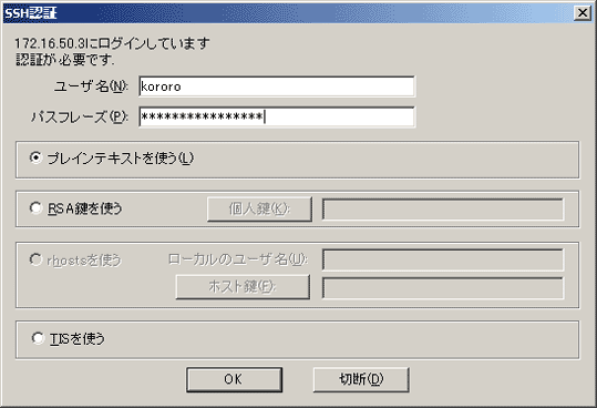 以下のような画面が表示されたら、ユーザー名とパスワードを入力し、「プレインテキストを使う」にチェックを入れ、「OK」を押します。プロンプト画面が表示されたら、無事ログイン成功です。尚、「RSA