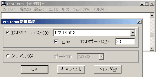 にTelnetでログインします。ここでは、TeraTermPro を使用してログインしますが、Windows標準付属のコマンドプロンプトからログインすることもできます。コマンドプロンプトを使用する場合は、「スタート」→「ファイル名を指定して実行」から「Telnet」と入力し、新規に現れたプロンプト画面にMicrosoft