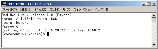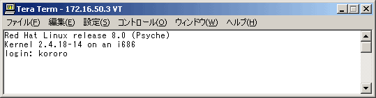 接続に成功すると、RedHatLinuxのバージョンやカーネルのバージョンが表示されます。Unixユーザー名とパスワードを入力しログインしてください。この時注意しておきたいのは、Telnetサーバーは、セキュリティの関係上からデフォルトでは