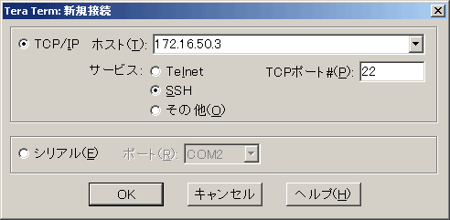 それでは、クライアントマシンからTeraTermを使用して実際にSSHでログインしてみます。TeraTermを起動して、「ファイル」→「新規接続」をクリックしてください。以下のような画面が現れます。ここでは、SSHを使用するので「SSH」チェックボックスにチェックを入れ、「TCPポート」が22番になっていることを確認してください(SSHのポート番号は22番です)。