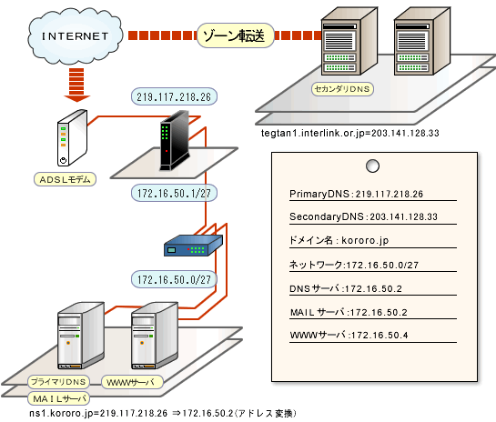 まず、筆者の環境では固定IPアドレスをひとつ取得しているので、プライマリDNSサーバーを自前サーバーとして、セカンダリDNSサーバーは各自加入しているプロバイダ、もしくは無料のセカンダリDNSサーバー業者を利用することを前提としてすすめます。固定IPアドレスはひとつしかないため、ルータ等のNAT機能により、アドレス変換をしてWAN側IPアドレスとLAN側IPアドレスを対応づけます。では、下記図に示す環境を想定してBINDの設定を行っていきます。