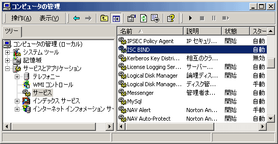 BINDがサービスに追加されているかどうか確認します。ここでは、まだBINDを起動しない状態にしておきます(もっとも起動できないと思いますが…)。