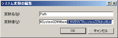 コマンドで移動するのは面倒くさいので環境変数にPATHを追加しておきます。「コントロールパネル」→「システム」→「詳細」→「環境変数」でPathを反転させて「編集」をクリックします。「変数値」に「;C:\WINNT\system32\dns\bin」と追記しておくと、コマンドプロンプト上でわざわざディレクトリを移動する必要がなくなります。