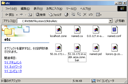 のみです。これらは、共通ファイルとなるのでLinuxからファイルをコピーしてetcディレクトリに格納しておきます。その後で、0.0.127.in-addr.arpa.zoneのネームサーバーの値だけセカンダリDNSサーバーのものに変更しておいてください。