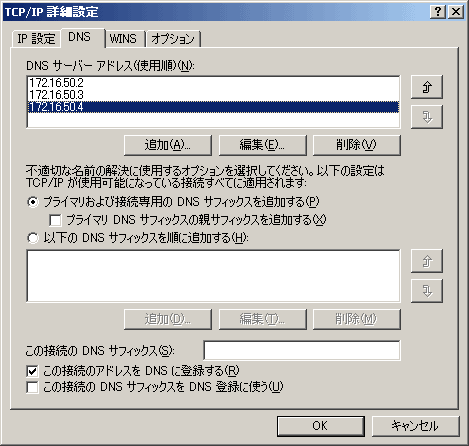 また、BINDをインストールしたPCのIPアドレスをTCP/IPのDNS欄に追加しておいてください。