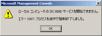 BIND起動時に以下図のようなエラー画面が現れた場合は、named.conf の記述が間違っているか、ファイルが存在しないなどの原因が考えられます。もう一度、named.conf