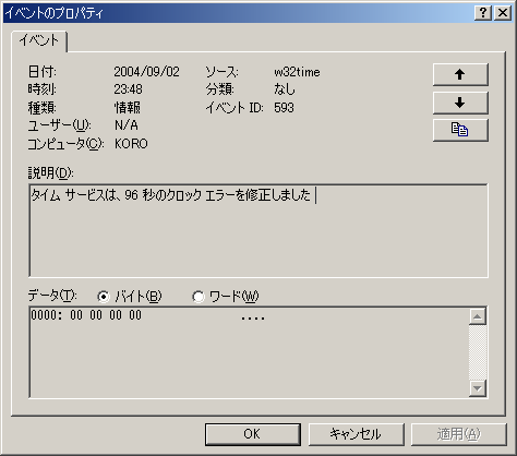 というイベントログをクリックして「プロパティ」を見てみると、以下図のように時刻のズレを何秒修正したかが表示されています。