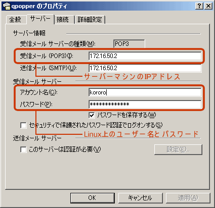 それでは、POP3対応のメーラを使用して、実際に受信を行ってみます。ここでは、Microsoft Outlookを使用してメールを受信することにします。メールアカウントの設定は下記図のようにしてください。確認しておきたいのは、Postfixでメールを送信してWindows上で受信できるのかということと、外部ネットワークから受信できるのか(携帯メールで送信するのがわかりやすいかも)ということです。
