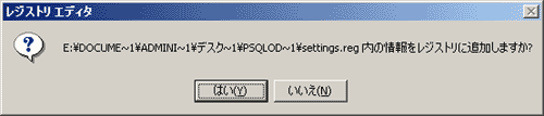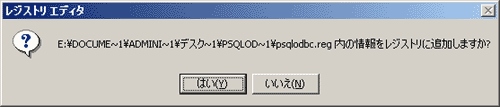 ■2.psqlodbc.reg を実行し、psqlodbc.dllファイルをレジストリに登録します。以下の画面が現れたら「はい」をクリックします。
