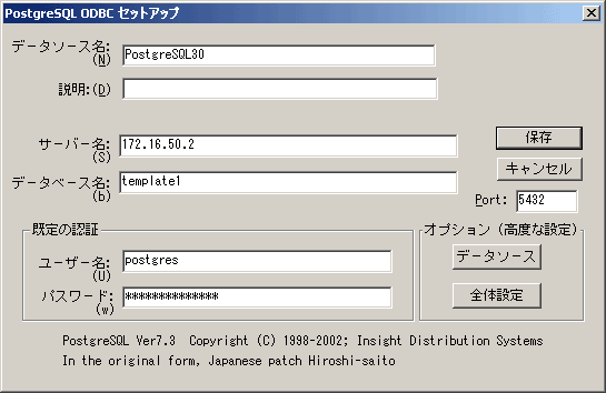 以下のように空欄を埋め、「保存」をクリックし、システムDSNに追加されたかどうか確認してください。既定の認証には、PostgreSQLに接続するユーザー名とパスワードを入力します。ここでのユーザー名とパスワードは既にPostgreSQLで作成済みのものを入力します。