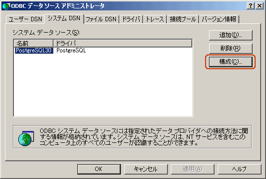 「コントロールパネル」→「管理ツール」→「データ ソース (ODBC)」を開いてPostgreSQL