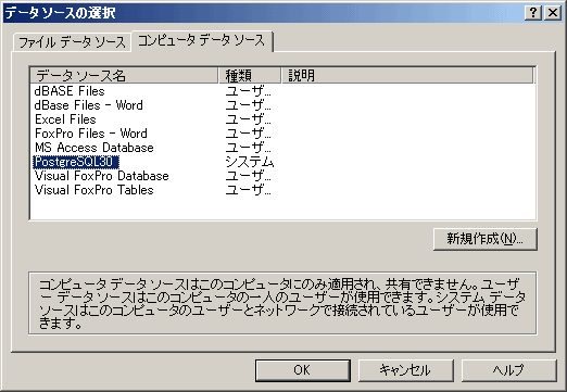 「データソースの選択」画面が現れたら、「コンピュータデータソース」タブをクリックし、先ほど作成したデータソース名をハイライト表示にし、「OK」をクリックします。