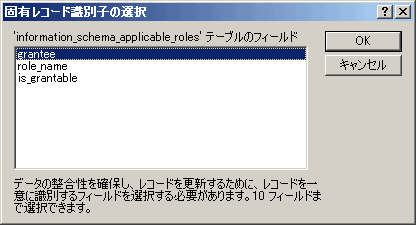 なお、リンク時に以下のように「固有レコード識別子の選択」画面が現れることがあります。テーブルにはレコードを一意に識別する主キーを設定しますが、主キーが設定されていないテーブルをリンクした場合には以下のような画面が表示されます。この場合は、主キーとするべきテーブルをここで選択するか、PostgeSQLで主キーを設定することで解決します。