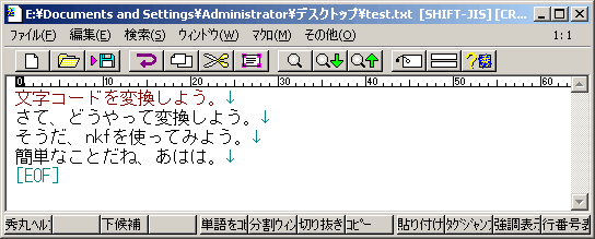 それでは、具体的な例を示します。ここでは、SHIFT-JISをEUCコードに変換する例です。この時に、注意したいのは、新規ファイル名を元ファイルと異なる名前に変更しないとファイルの中身が削除されてしまいます。ここでは、test.txtをtest1.txtとファイル名を変更しています。