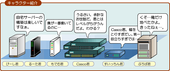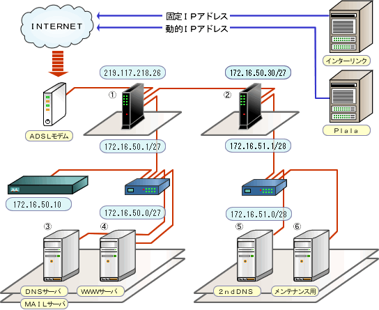 プロバイダに複数加入しているのは特に意味はありません。解約がめんどくさいので、どうせ安いし加入しているだけかな…。でも、YAMAHAルータはPCごとに接続する回線(プロバイダ)を選択することができるようなのでとりあえずは、サーバーマシンを固定IPで、個人用PCを動的IPアドレスで接続しています。あと、Ciscoルータは特に意味ありません(笑)。10Base-Tなのでちょっとメインのルータとしては使う気が起きませんね(-。-;) たまに触る程度です。PCのスペック、その他周辺機器などは、姉妹サイトの「参考:自宅サーバー環境」を参考にしてください(手抜きw)。