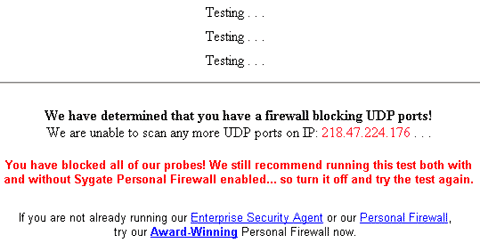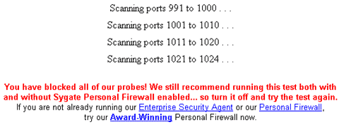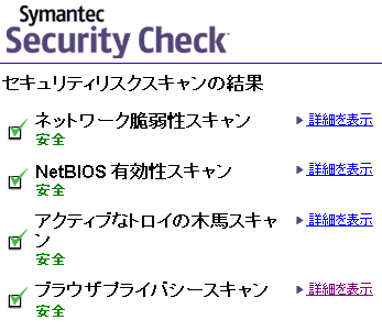 ノートンアンチウィルスでも有名なシマンテック社のセキュリティ診断サービスです。特にWindowsでよく使用されるポートのチェックを行ってくれます。以下の図のようになっていれば、大方は問題ありません。なお、ZoneAlarmを使用して診断チェックを行った場合と、Sygate