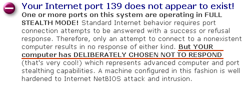 Internet port 139 does not appear to exist!(139番ポートは存在していません)」となれば、NetBIOS(NBT)を経由した攻撃に対して、応答せずに存在を仮想的に隠蔽することで、そのコンピュータは十分な防御対策が既に施されているということを意味します。