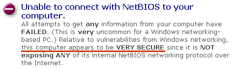 to connect with NetBIOS to your computer(あなたのコンピュータへ接続できませんでした)」と表示されれば合格です。あなたのコンピュータはインターネットに対して内部のNetBIOS(NBT)ネットワークが不可視の状態となっており、外敵からの攻撃に対して高いレベルのセキュリティが施されていると判断しています。