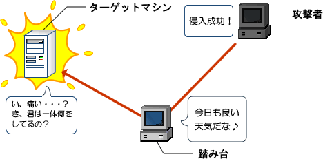 「踏み台」とは、不正にコンピュータ内部へ侵入され、さらに別のネットワークなどへの侵入や攻撃などのために利用される中継点のことです。「踏み台」として狙われるコンピュータは、当然、セキュリティの甘いコンピュータ=個人のコンピュータということになります。万が一、自分のコンピュータが「踏み台」として利用された場合、一見、自分が被害者であるかのように思いますが、クラックされた側からすれば、皆さんは加害者となってしまいます。「踏み台」は利用する人も利用する人ですが、利用される人も利用される人で、特に、サーバーを管理している人なら他人に迷惑をかけないためにも「不正侵入」への対策は当然、施しておくべき社会的な責任と言えるでしょう。