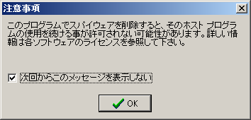 Spybotが起動する前に、以下のような注意事項が表示されます。「次回からこのメッセージを表示しない」にチェックをつけて、「OK」をクリックします。