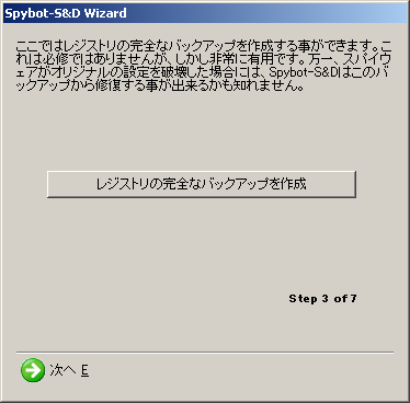 レジストリをバックアップするかどうか聞かれる画面が現れたら、「レジストリの完全なバックアップを作成」をクリックします。バックアップ中、画面が止まったように見えますが、バックアップが終了するまでお待ちください。バックアップが終了したら、「次へ」をクリックします。