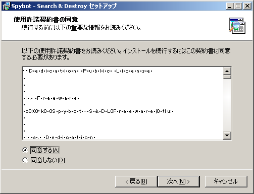 使用許諾契約書は文字化けしていて読むことができませんが、「同意する」のチェックボックスにチェックをつけて「次へ」をクリックします。