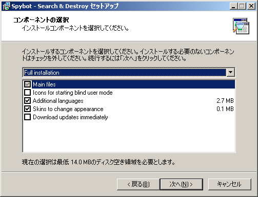 コンポーネントの選択画面になります。デフォルトの「Full installation」を選択したまま、「次へ」をクリックします。チェックボックスは、アイコンやらスキン、追加言語などをインストールするか否かのチェックボックスです。デフォルトの状態のままで問題ありません。