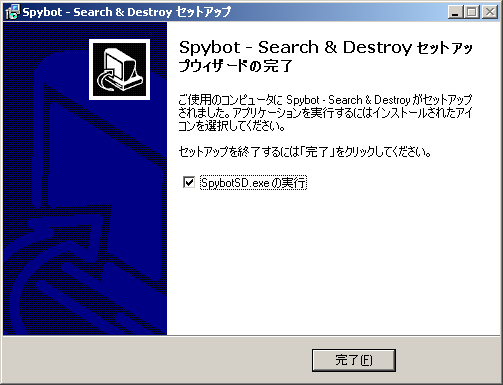「SpybotSD.exe」のチェックボックスがついたまま、「完了」をクリックします。