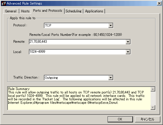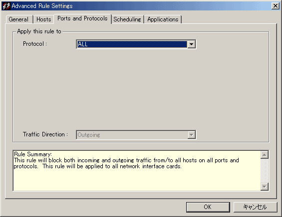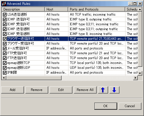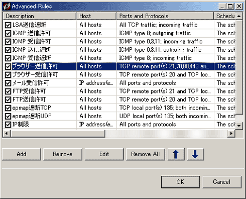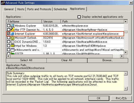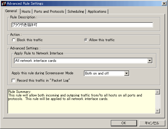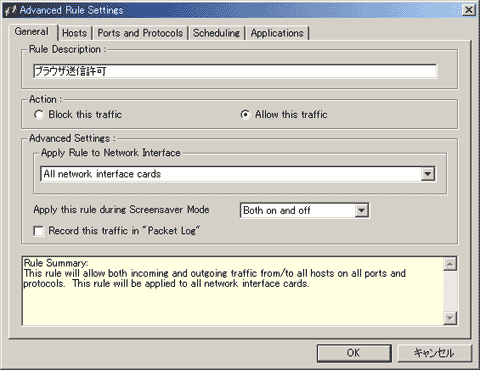 Explorer、NetscapeNavigator、その他のブラウザ全てにチェックを入れます。これで、ルール1「ブラウザ送信許可」は、ブラウザに対して適用されることになります。なお、今まで行ってきた設定は「Rule