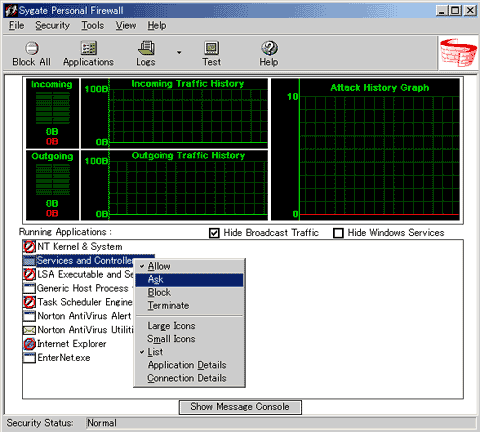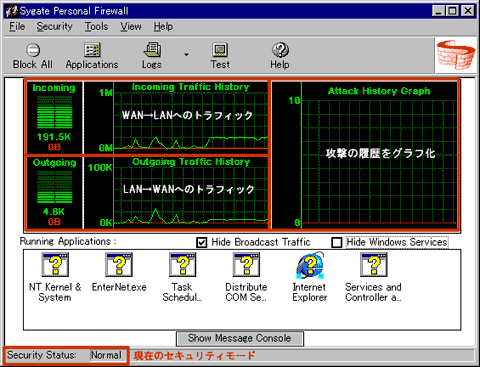 Sygate Personal Firewallを起動すると以下のような画面が表示されていると思います。ここでは、主に送信トラフィック、受信トラフィック、攻撃の履歴といったパラメータが表示されています。ここでは特に説明はいらないとおもいますが、重要な項目といえば「Running